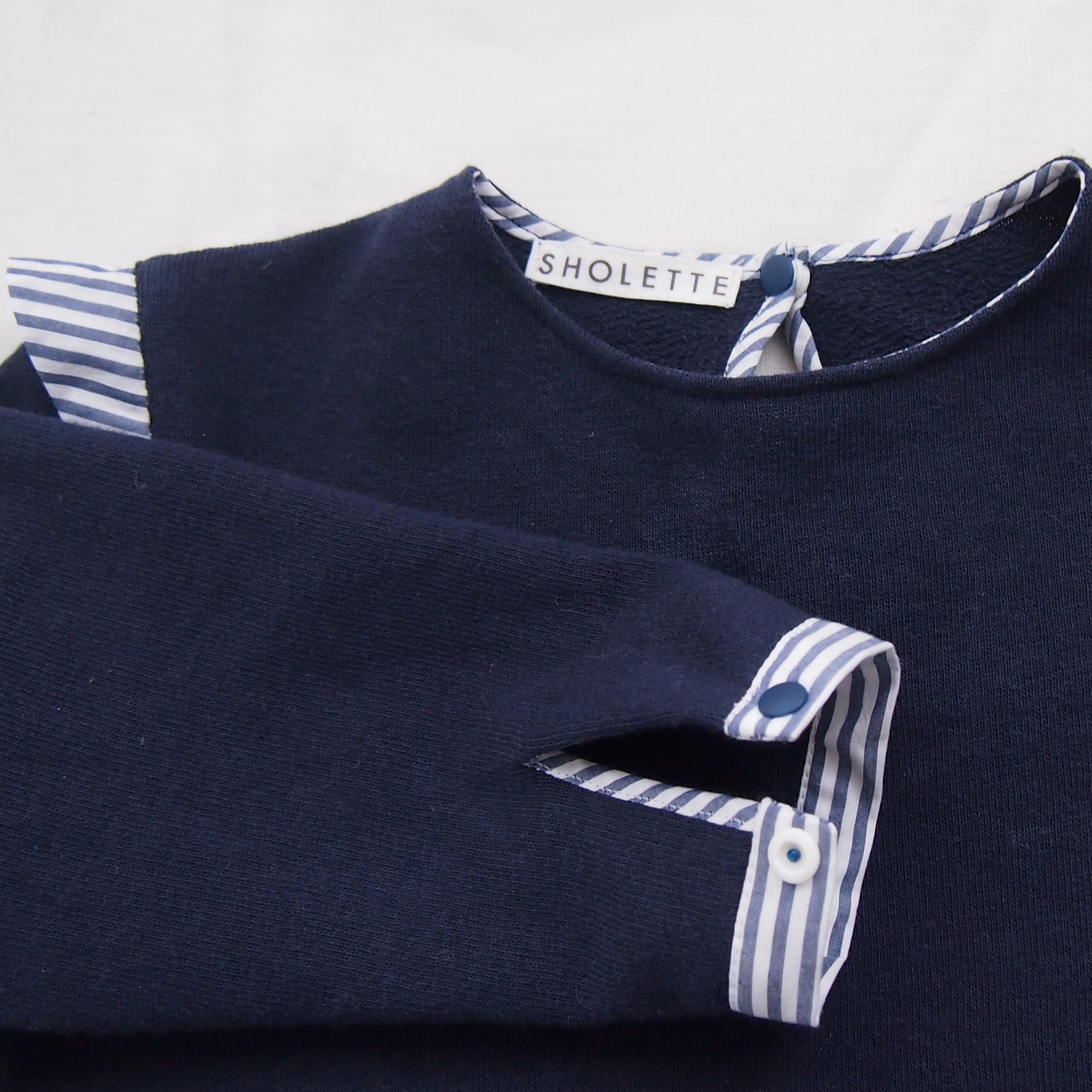 肩やカフスもストライプ生地が使われていて、シンプルなトレーナーのアクセントになっています。