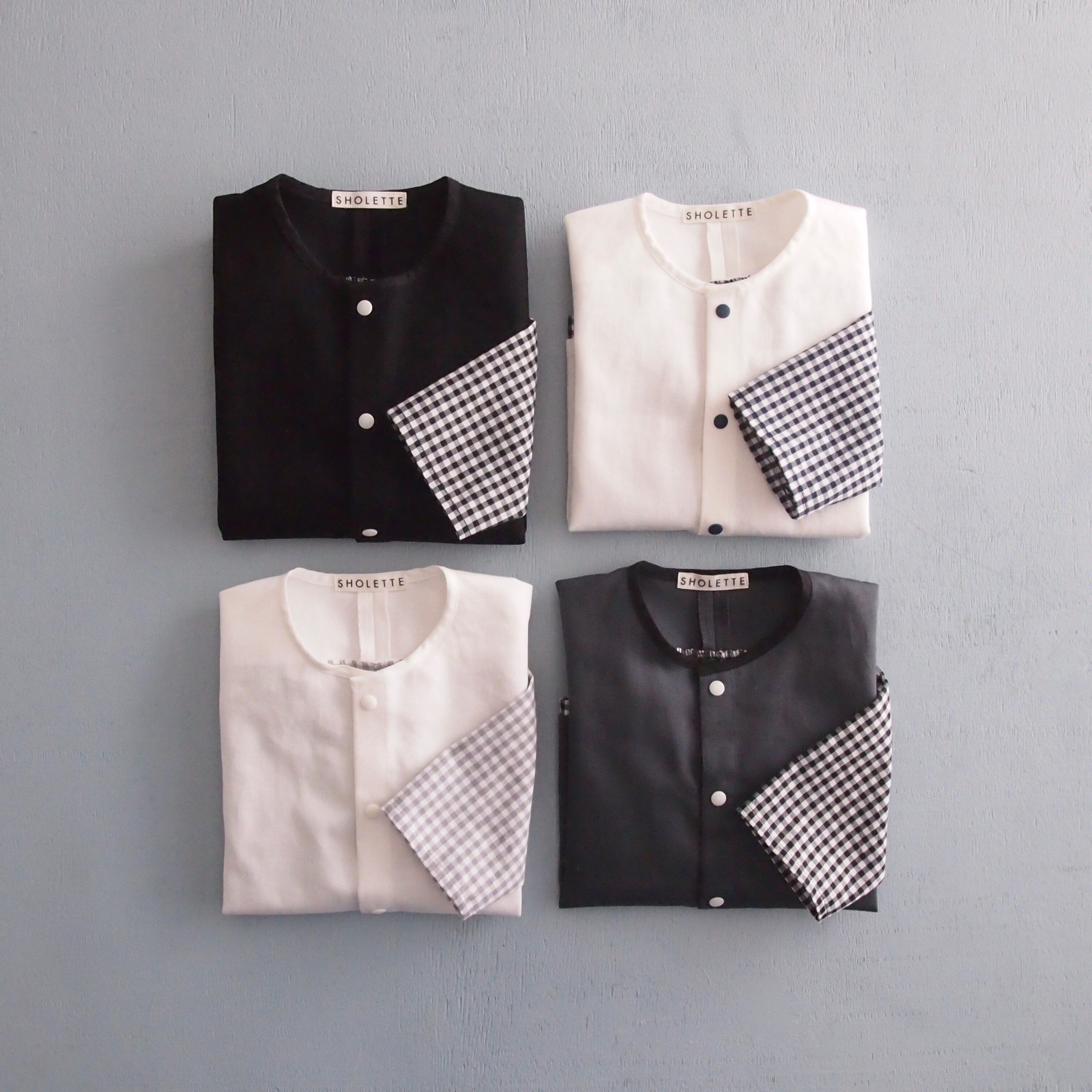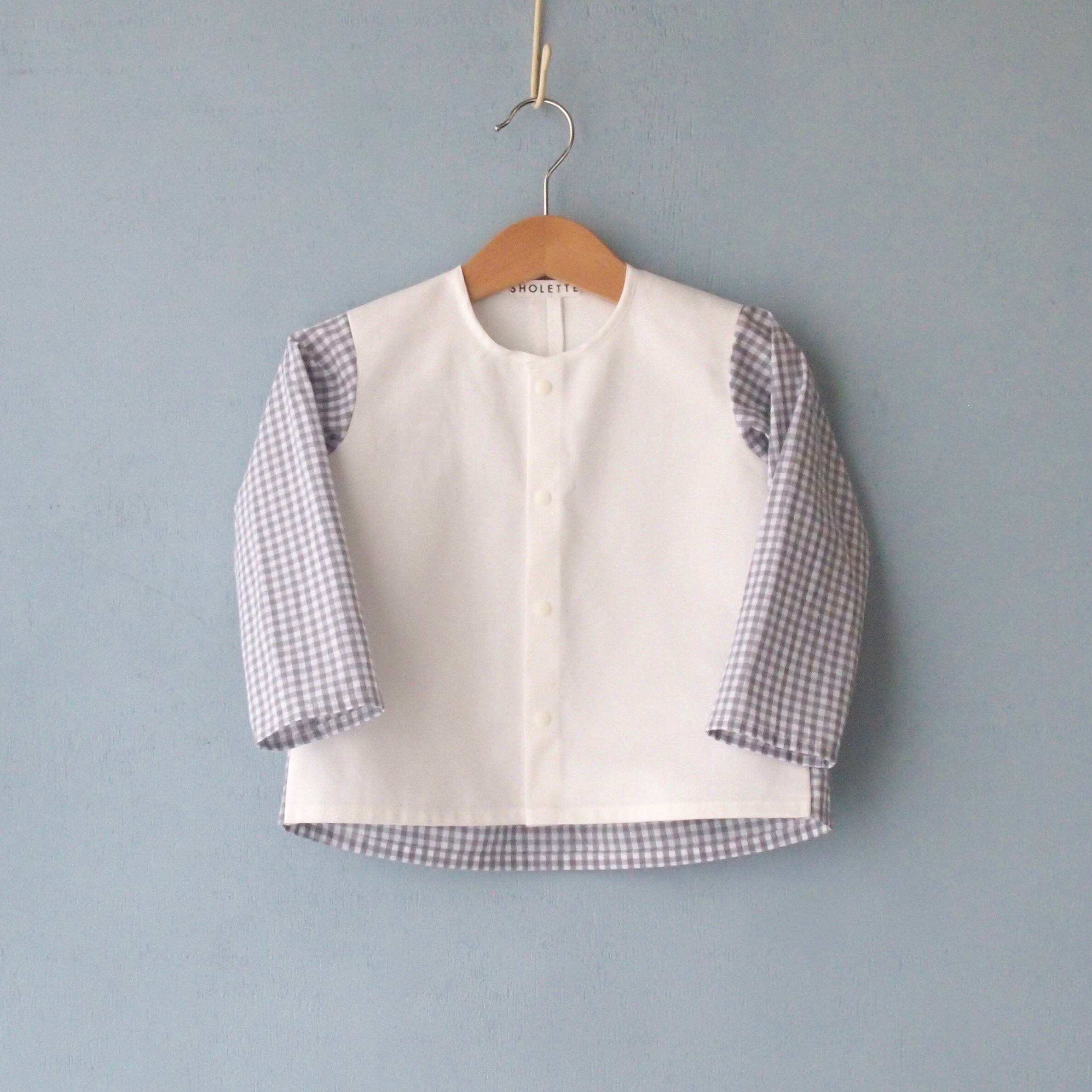 前は白地に白のスナップ、後ろは薄めのグレーのギンガムチェックでとても爽やで優しい配色です。
